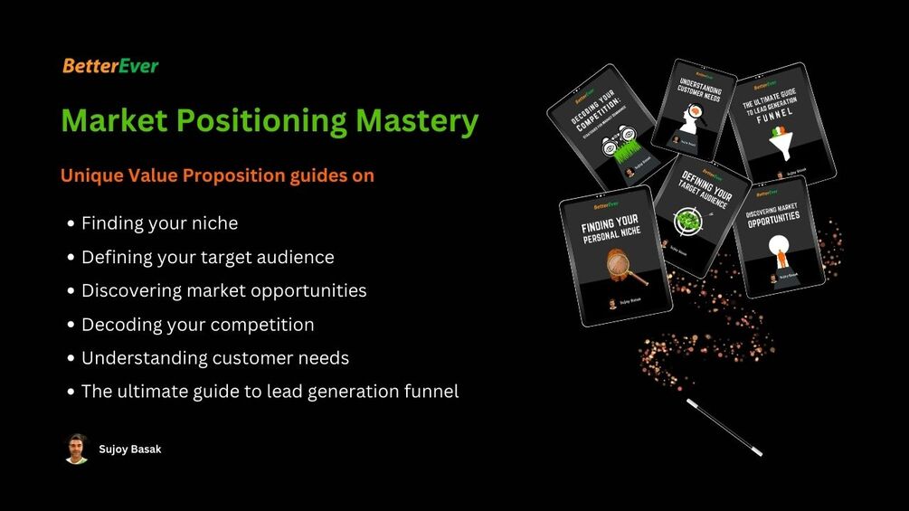 You will receive a comprehensive set of 6 Guide Books, namely: Finding your niche, Defining your target audience, Discovering market opportunities, Decoding your competition, Understanding customer needs, The ultimate guide to lead generation funnel